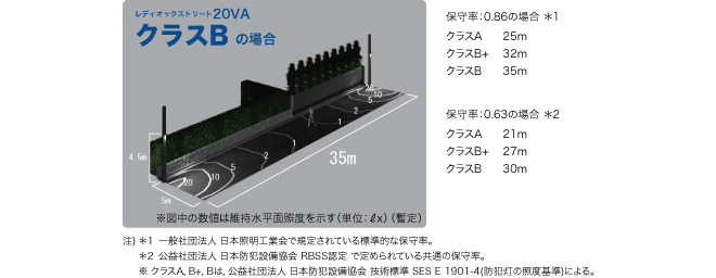 配光性能はクリアグローブタイプ,乳白グローブタイプともに現行品と同等である。クリアグローブタイプは,通路形状に合わせた横長に光が広がる配光により,設置間隔は保守率0.86の場合で『クラスB,35m』を実現した。照度分布図を図4に示す。