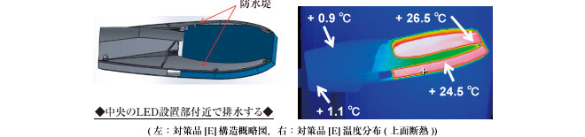 4.1節,4.2節の対策においては,ツララは抑制されるが,前述のとおり従来品に対してデメリットが発生している。そこで,「LEDの熱で雪を解かしながら,ツララができないように高温部から排水し,なおかつツララが形成される場合でも,配光を妨げない箇所に形成される形状」が理想と考え,鋭意検討した結果,外周部に防水堤を備えた内部排水構造(対策品[E])を考案するに至った。対策品[E]の構造,温度分布を図7に示す。