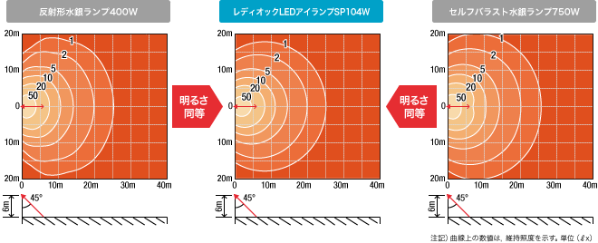 図3 反射形水銀ランプ400Wとセルフバラスト水銀ランプ750Wとの照度分布比較