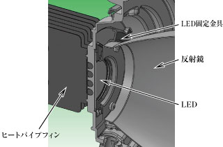 本LEDパッケージは従来のLEDパッケージよりも高出力であるため,ヒートシンク部における放熱構造の改良を行った。従来と同様のヒートパイプフィンからの放熱に加え,円周状にフィンを設けたヒートシンクからも放熱させることで,さらに放熱効果を向上させている。