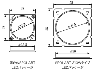 外観は従来のHID投光器を継承し,光束は,水銀ランプ1000W相当のSPOLART 210Wタイプが22000ℓmに対して,メタハラ1000W相当の本商品,SPOLART 310Wタイプは約1.8倍の40000ℓmを有する。