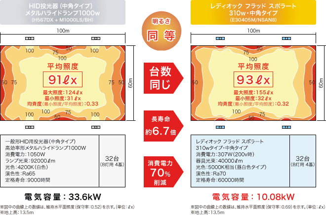 メタハラ1000W投光器の代替となるように,器具光束を40000ℓm,1/10ビーム角を中角タイプは62°,広角タイプは90°とした。HID投光器と同条件で比較すると,照度分布は同等,光源寿命は約6.7倍,消費電力は約70%削減となる。