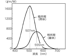 視覚に関する光放射量は,明所視の視感度曲線(図3)を重み付け関数として380~780nmの範囲の光放射を積分した量であり,波長555nmの1ワットの放射が光束683ルーメン(ℓm)となる。このような光束・光度・照度・輝度などは,物理量であるワットを脳で感覚量に変換しているので心理物理量と呼ばれる。