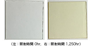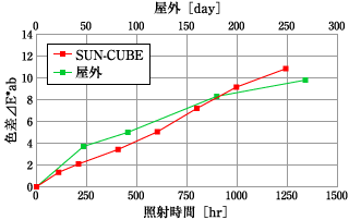 照射試験の一例として,樹脂(PCクリア)の試験結果を図6に,色差,光沢保持率の動程曲線を図7,8に示す。試料台に試験片をセットするだけで試験が可能であり,簡単に劣化(色変化)が確認できる。