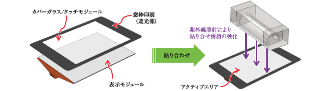 中・小型ディスプレイモジュールの製造工程において,表示モジュールのアクティブエリア外の電気配線や表示モジュールの縁部などを目隠しして,また,顧客に合わせた製品装飾にするための窓枠印刷などが施されているカバーガラス(トッププレート)と表示モジュールの貼り合わせが行われる。