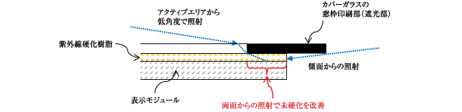 従来は,貼り合わせた後に,カバーガラス側よりまず紫外線を照射してアクティブエリア部(窓枠内側の表示部)を硬化させ,窓枠印刷下部の未硬化部を側面照射などにより硬化させていた(図5)。しかし,この方法では配線や実装部品等による照射光の減衰が大きく,未硬化や硬化不良の問題が発生していた。