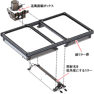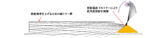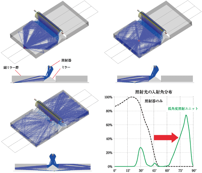 低角度照射ユニットの外観は図7のようになり,照射器直下に照射光を低角度にするミラー部と,照射効率を向上させるための副ミラー群からなる複合構造となっている(図8,図9)。