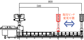既存製品は取付ピッチが800mm,500mmの2種類あり,それぞれ専用の器具であったため,注文する前に取付ピッチを決める必要があったが,本商品はパイプ保持金具の位置を変更することで,両方のピッチに対応することを可能とした。そのため,注文後に現場にて希望する取付ピッチを選択することができる(図6)。
