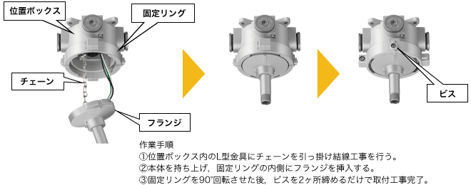 本商品には照明器具の取付工事を省施工化する『省施工形位置ボックス』を搭載している。固定リングを回転させる新機構方式を採用することで取付工事の作業性を向上させた(図7)。