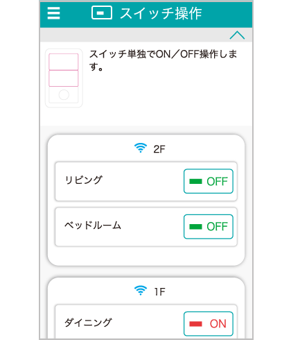 このIoTスマートスイッチ「Link-S²」は,図2の専用のアプリケーション(以下,アプリ)を使用することでスマートフォンやタブレット(以下,端末),または音声認識デバイスから照明や換気扇のON/OFFを操作することができる。