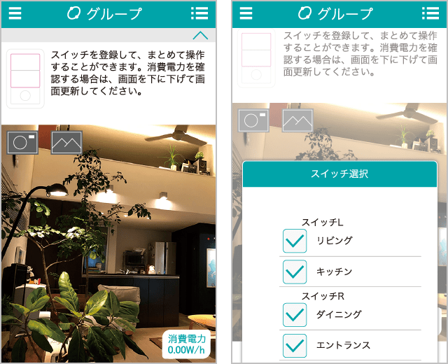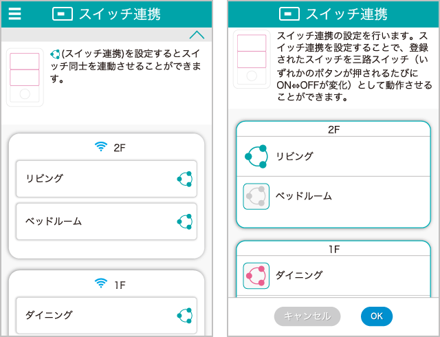 「スイッチ連携」では,一つのスイッチを操作することで,二つ以上のスイッチを同時にON/OFF操作することができる。例えば,図4のようにリビングとダイニングを専用のアプリでスイッチ連携させると,リビング照明のスイッチをONにすればダイニング照明のスイッチも一緒にONとなる。