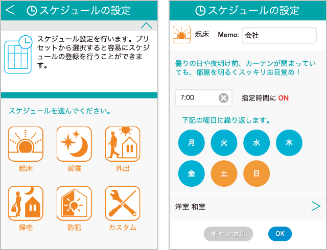 「スケジュールの設定」では,設定した時間に指定した照明(グループで設定)をON/OFF操作することができる。デフォルトで起床(指定時間にON操作),就寝(指定時間にOFF操作),外出(指定時間にOFF操作),帰宅(指定時間にON操作),防犯(指定した時間にON/OFF操作)があり,カスタムを選択すれば任意の時間や曜日に指定した照明のON/OFF操作を設定することができる。また,設定の追加または内容を変更したい場合は外出先からでも行うことが可能である(図7)。
