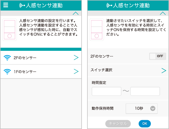 「人感センサ連動」では,センサの設定をONにすることで,感知したときに指定した照明(グループ)をONにすることができる。つまり,感知したセンサのスイッチに接続されている照明を点灯させるのはもちろん,他の照明を指定すればその照明を点灯させることもできる。また,センサを感知させる時間帯の設定や照明の点灯保持時間の設定も行うことができ,スケジュールの設定と同じように設定内容の変更などは外出先からも行うことが可能である(図8)。