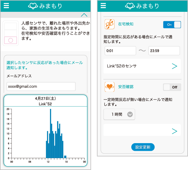 みまもりは,離れた場所や外出先から家族の生活を見守るための機能である(在宅検知,安否確認)。例えば,時間を設定し,その設定した時間内に指定したセンサに反応があった場合,または,指定した時間以上に指定したセンサに反応がない場合に,あらかじめ登録したメールアドレスに在宅の確認や安否の連絡を送ることができる。また,図10のように当日のセンサデータはもちろん,1週間前までさかのぼってセンサデータをグラフで確認することもできる。