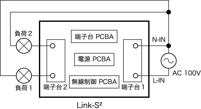 図11は「Link-S²」の構成図である。入力のAC100Vは電源PCBA(Printed Circuit Board Assembly)でDC電圧に変換され,Wi-Fiモジュールが搭載されている無線制御PCBAへ供給している。そして電源PCBAにはメカニカルリレーが実装されており,入力用の端子台1と負荷用の端子台2の間はこのメカニカルリレーの開閉によって負荷のON/OFFが制御される。