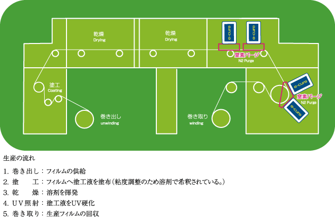 フィルムコーティング関連の生産ラインは大まかに図2のようになっており,その中で照射器は図3のような水平WEB方式やOn Roll方式で設置される。従来のスイング式シャッターの照射器をフィルム生産ラインにおけるローラー部に設置した場合の状態を図4に示す。