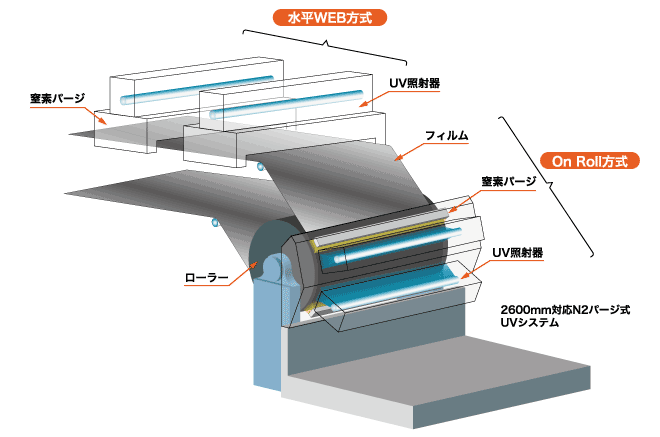 フィルムコーティング分野における被照射物の幅寸法は,標準でも1600mmから長いものでは3000mm近いものがあるため,それに合わせて使用するUVランプの発光長も1000mm〜3000mmと長尺になる。その場合のシャッター方式はシャッター板の自重たわみ,熱変形に対して優れているスライド式かスイング式が主に採用されている。