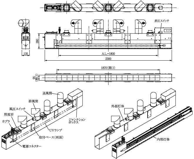 | 適合ランプ | 水銀,メタルハライドランプ共用(本機専用ランプ) 36kW(200W/cm),発光長=1800mm |