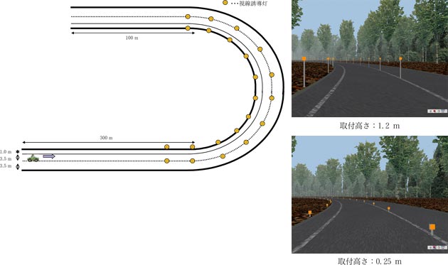 実験は前述の所要光度を求めた場合と同じように,実フィールドで行うのが望ましいが,必要となる機材の量や,フィールドの確保の面などで難しいため,バーチャルリアリティ(以下VR)を使用した。VRを利用すれば,周囲の環境,コーナーの曲率半径,設置場所,取付間隔,取付高さが任意に設定でき,迅速に評価が行えるという利点がある。今回VRで想定する場所は,昼間の山間部コーナーとし,複数の曲率半径に取付間隔,取付高さ,設置場所を変えてLED視線誘導灯を設置する。