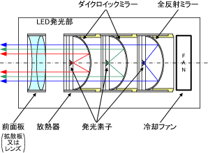 光源部の構造を図6に示す。外形寸法は図3に示した。3個の放物面反射鏡の焦点位置にR,G,Bの各LED発光素子がそれぞれ配置されている。3個の反射鏡のうち奥の反射鏡は全反射ミラーとしてあるが,出射側の2個にはダイクロイックミラーが施してある。RのLED発光素子を包囲するダイクロイックミラーは赤色光を反射しそれ以外の光を透過する特性を,GのLED発光素子を包囲するダイクロイックミラーは緑色光を反射しそれ以外の光を透過する特性を持つ。出射口の前面板には,図では直線的出射光を得るためのレンズを配置したが,集光レンズ,拡散板を配置することもできる。背面には冷却ファンを設けて強制空冷すると共に,光源の筐体にはLEDが発する熱を外部へ放出できるように工夫を施した放熱器を設置している。