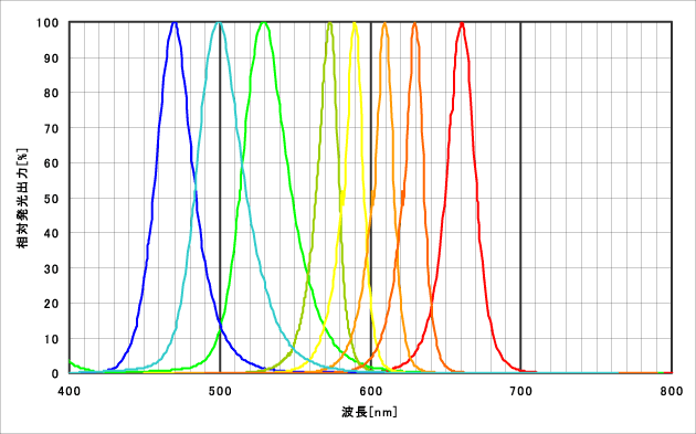 本装置は,光の3原色であるR(赤色),G(緑色),B(青色)の各LED(ピーク波長はそれぞれ,R:625nm,G:530nm,B:470nm)をそれぞれ搭載した3体の反射型LEDランプ(LEDから放出される光のほぼすべてを一度,凹面状の反射面に反射させてから外部へ放射する構造)を同一光軸上に重ねて配列した構造を有し,反射型LED ランプの反射面に金属酸化物多層膜からなるダイクロイックミラー(波長選択膜)を施すことで同一光軸上から光を発する仕組みになっている。なお,赤色発光波長が625nmのLEDを採用した理由は,純赤色の発光波長660nmのLEDでは光出力が低く寿命が短いのに対して,625nmのものは比較的赤色に近く高光出力,長寿命であるからである。参考のため,図5に既に商品化されている代表的な可視光LEDの発光波長特性を示す。