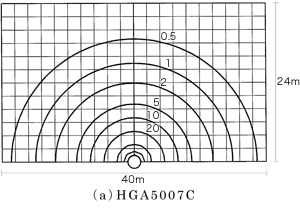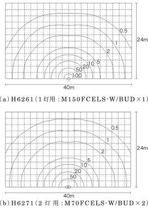 図5にH6261,H6271の水平面照度分布を示す(範囲:24×40m,設置高さ:4.5m,光源:H6261=M150FCELS-W/BUD×1 H6271=M70FCELS-W/BUD×2)。また同設置条件での比較対象として,HGA5007C(丸型グローブスタンダード街路灯+上方カットルーバー付,光源:HF250X)の水平面照度分布を図6に示す。