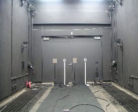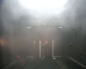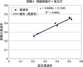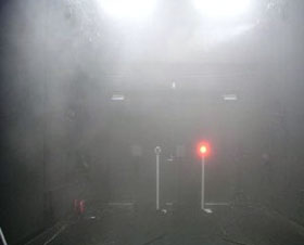 シミュレーションソフトに関しては現在,画像表示モデルをほぼ完成し,霧散乱モデルのプログラムを作成している段階である。しかし,シミュレーションソフトが完成しても,それの適否を検証する手段がない。この為,独立行政法人交通安全環境研究所の低視程実験棟を借りて,室内実験を行ない,その取得したデータを使って検証する事にした。この室内実験では,視程(霧の濃度)を変化させ,その時の輝度(対象物),水平面照度,鉛直面照度,時刻,温度を取得した。霧発生では視程を一定に設定しても,実際には霧濃度は変化する為,1秒毎のデータをパソコンに記録し,測定した時間から正確なデータを読み取った。検証結果の詳細は次号に報告するが,現時点の解析結果では,視線誘導灯は実測結果とシミュレーション結果が近似し,有効性が確認されている。以下に測定風景を示す。