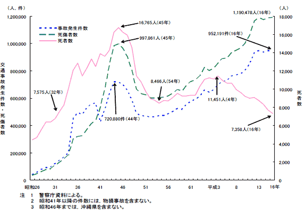図1 交通事故発生件数,死傷者数及び死者数の推移