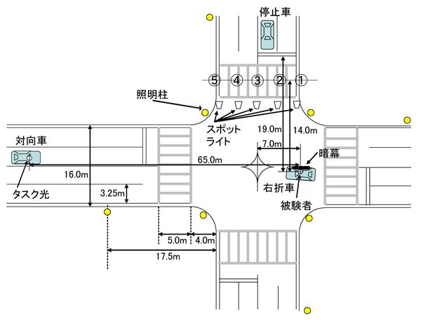 実験は,茨城県つくば市の国土技術政策総合研究所内に図7に示す環境を整備し実施された。交差点内の明るさは,ND フィルターを用いて平均水平面照度を5.0ℓxに調節している。被験者が視認する歩行者5名は,上下黒の服を着て図7の①から⑤の各位置に,①から⑤を臨む方向に向かせて一列に立たせている。被験者は,若年者6名と60歳以上の高齢者6名から構成している。視認実験は,歩行者位置(5水準),歩行者の鉛直面照度(5ℓx,10ℓx,20ℓx,40ℓxの4水準),停止車両のヘッドライト点灯の有無(2水準)ら3要因をパラメータとして,従属変数を歩行者の見易さとして実施している。