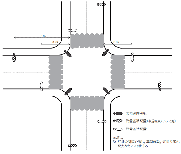 - 交差点内の平均路面照度は,周囲が暗い場合でも10ℓxを確保することが望ましい。