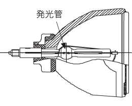 図1,図2はプロジェクタ用の120W超高圧水銀ランプの外観と構造を示している。このランプは発光管,リフレクタなどから構成され,ランプ全長は80mm,発光管の外径が10mmであり,電極間の距離は約1mmとなっている。また点灯時の発光管内部の圧力は約150気圧にも達する。発光管から出た光が周囲のリフレクタによって反射され,ランプ前面に投射される構造となっている。
