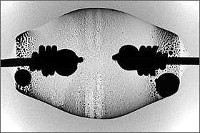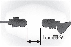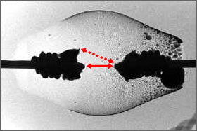 図3は未点灯のランプ電極のX線写真である。このランプを数百~数千時間点灯すると,図4のように電極の形が変形してしまうことがある。発光管中のアークは,とがった場所から発生しやすい傾向があるため,通常は図4の実線矢印のところでアークを形成している。しかしランプの状態によっては,点線の矢印の場所でアークが形成されたり,実線と点線矢印の場所を交互にアークが移動したりする現象が発生する。このわずか0.5mmにも満たないアークの発生場所の変化が,プロジェクタにおいては「ちらつき」となって現れる。