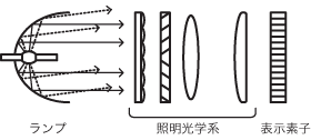 プロジェクタは,ランプから照射された光をミラーやレンズなどからなる照明光学系を使って表示素子(液晶など)に導き画像を作り,投射レンズによって画像をスクリーンに投影する。