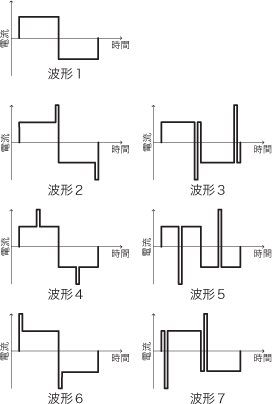 図7が今回実験したランプ点灯電流波形である。重畳するパルス電流の方向が矩形波半波の電流方向に対して正と負の2種類,位置が矩形波半波の前・中・後の3種類で,通常の矩形波とあわせて合計7種類となる。