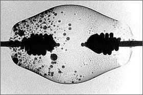 図8では写真左側の電極先端が削れて上下が突き出した形になっている。アークが上下の突き出しを移動する時に大きな「ちらつき」が発生するものと思われる。それに対し,図9では電極中央に突起が保たれており,安定したアークの発生起点となっている。