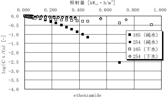 図3~5に示すグラフは照射量[kWuv・h/m³]を横軸に,その時の残存率を対数に取ったもの:log(Ct/Co)[-]を縦軸にしてプロットし,その変化を比較した。