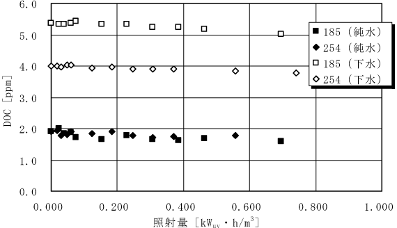 下水二次処理水を用いた時,DOC濃度が純水に比べ高いことより(図6),医薬品以外の物質が紫外線を吸収,もしくは消費するために除去効率が下がると考えられる。