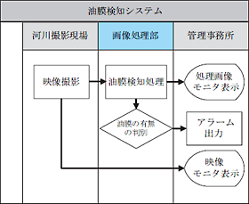 図8は,提案する油膜検知システムの処理の流れを示している。はじめに,撮影された映像は,同図に示すように画像処理部へいくものと,処理をせずモニタに出力されるものとに分かれる。そのため,油膜の有無に関わらず河川状況を常時モニタリングできるようになる。次に,画像処理部では,前述の画像処理方法により水面上の油膜の有無の判別を行なう。さらに,油膜が検知された場合にはアラームが出力される。なお,処理画像は油膜の有無に関わらずモニタに出力される。