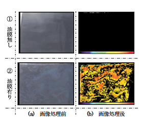 図9は,油膜検知処理結果の一例を示したものである。同図より,画像処理前後の画像をモニタ表示することにより,油膜の有無がより明確になることがわかる。