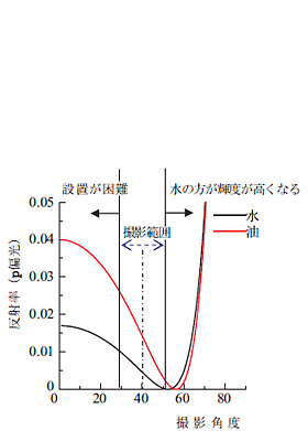 CCDカメラは,水面上の光源の映りこみを撮影するため,光源に対し正反射方向に配置される。このとき,撮影角度は水と油の反射率の差がなるべく大きくなるように配置しなければならない。図11は,水と油の撮影角度に対する反射率(p偏光)の差を示したものである。同図より,撮影角度が約50°以上で,水の方が油より反射率が高くなっていることが分かる。また撮影角度が約30°以下では,水と油の反射率の差は大きいが,光源とカメラの位置がほぼ水面真上になり,設置が困難となる。このことから本研究では,光源の入射角度,CCDカメラの撮影角度をそれぞれ40°とした。