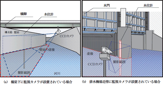 同図の監視カメラは橋梁下や排水機口の近傍に設置され,河川側壁の水位計を監視しているものである。この場合,橋梁下や水路内を撮影するため外乱光の影響が少なくなる。また,光源としては,河川側壁の水面への映りこみを代用できる。