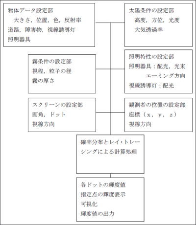 交通安全を目的に,霧環境下での自発光式視線誘導灯の見え方,及び霧環境下での障害物の見え方が机上で検討できる照明シミュレーションソフト(以下,単に「ソフト」と略す)の開発に2005年4月から取り組んできた。