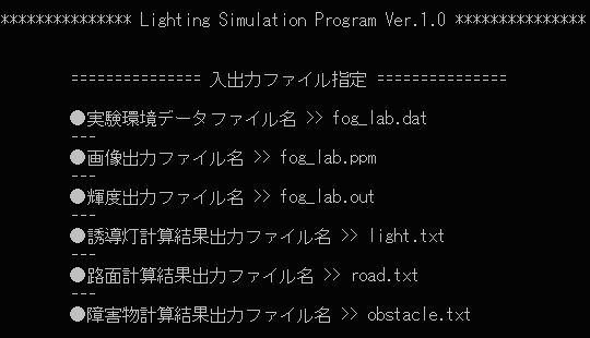 計算を行う場合は事前に,環境データ(2.1節で述べた)を作成し,ファイル名を付けて保存し,更に,誘導灯や照明灯の光度,障害物の反射率等はマクロ変数で定義しておく必要がある。ソフトを実行すると,入出力のファイルとして,環境データの入力ファイル名と計算結果を格納する出力ファイル名5つを順番に聞いてくる。