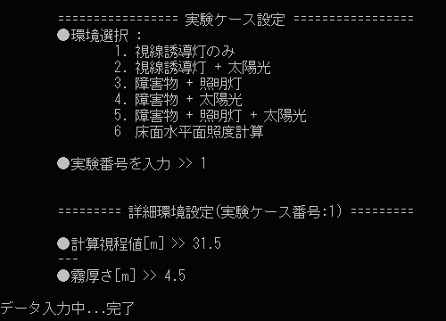 続けて,計算の種類を示す番号(1~6)を選び,視程値と霧の厚さ(高さ方向)を入力する。種類には,1.視線誘導灯のみ,2.視線誘導灯+太陽光,3.障害物+照明灯,4.障害物+太陽光,5.障害物+照明灯+太陽光,6.床面水平面照度,があり,6の床面水平面照度はMie散乱式との比較を行うために,特別に組み込んだものである。
