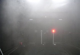 ソフトの検証を行うために,交通安全環境研究所の低視程棟を使用し,霧の有/無,太陽光(蛍光灯)の有/無の環境下での実験を行い,更に,障害物については,照明灯有/無の環境下での実験を追加し,データを取得した。