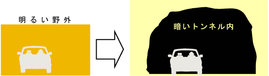 車両が照明の不完全なトンネルに進入した直後,しばらくの間,運転者にはトンネル内が非常に暗く見え,その詳細を識別できなくなることがある(図2)。これが,順応の遅れ現象(ブラックアウト現象)と呼ばれるものである。