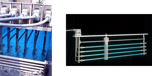 下水においては,UV消毒装置として多く下水処理場に設置されている。薬品などを添加する従来の方法とは異なり,処理水に薬品や副生成物などの残留物が排出される恐れがない処理方法として利用されている。本装置は図3に示した通り,ジャケット(保護管)に入ったUV殺菌ランプをユニットにし,それを用水路中に水没させ排水時に殺菌する。用水路に設置できない場合などユニットを組み込んだ容器(パッケージ型)も利用されている。
