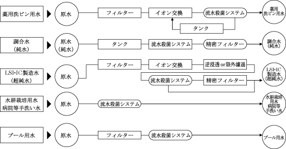 各種用途に対して原水の処理システム例を図4に紹介する。図からわかるように,殺菌が必要な水は多く,UV照射のみで殺菌が行なえるため,原水に影響を与えない有効な処理方法であるので,利用はさらに拡大していくことが予想される。