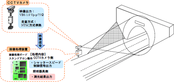 - トンネル坑口から視距に相当する位置に対角画角64°以上のカメラと画像処理ボードをトンネル坑口中心に向けて設置する。