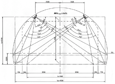 トンネル照明設計は,道路照明施設設置基準に基づき設計を行なった。トンネルモデルは,形状は馬蹄形,トンネル延長500m,車道幅員7m及び設計速度60km/hと国土交通省の代表的なモデルを用いた。トンネルモデルの断面図を図3.4に,その他のパラメータは,表3.1に示す。